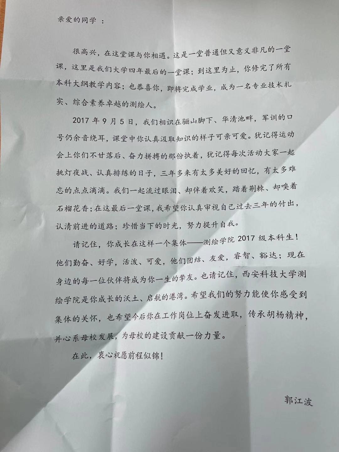 12月15日,suncitygroup太阳集团2021届毕业生迎来大学四年的最后一堂课,毕业生辅导员郭江波为员工送去祝福,希望这份努力使同学们感受到集体的关怀,也希望即将离校的员工们今后在工作岗位上奋发进取,传承胡杨精神,心系母校发展,为母校的建设贡献一份力量。