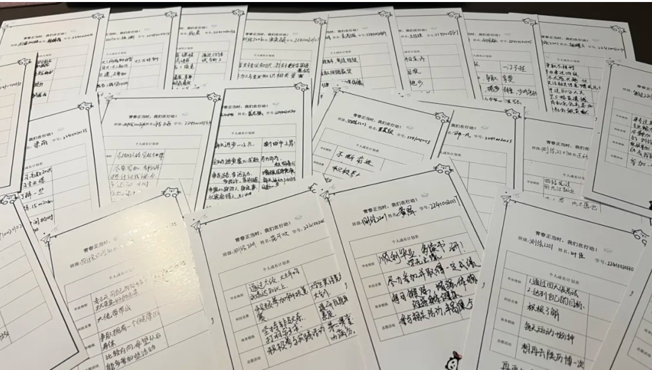 “学业规划”、“学科竞赛”、“体育锻炼”、“志愿服务”,所有人看着桌面卡片上的文字,均迟迟没有下笔,卡片上“青春正当时,我们在行动”这行字仿佛定格住了这一时刻,而后又将这一时刻大家的深深沉思化为这一张卡片上书写的每一个字、每一个标点,“我要通过六级考试”、“一定要在学科竞赛拿奖”、“每天锻炼半个小时”、“还想再去兵马俑参加志愿服务”,每一个目标都在纸张上留下痕迹,见证着大家大三学年“理想的足迹”……。
