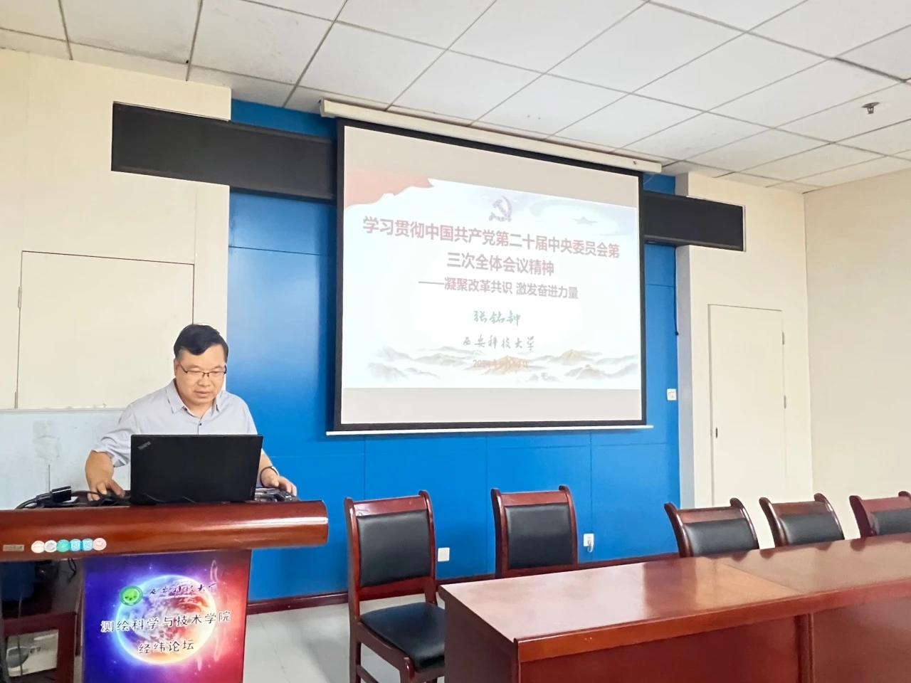 9月10日下午,suncitygroup太阳集团按照公司党委安排部署,在雁塔校区煤科大楼511召开学习贯彻党的二十届三中全会精神宣讲报告会,公司邀请马克思主义公司副经理张铭钟教授为全体教师、员工代表进行了透彻深入的宣讲、鲜活生动的解读,会议由公司经理李朋飞主持。