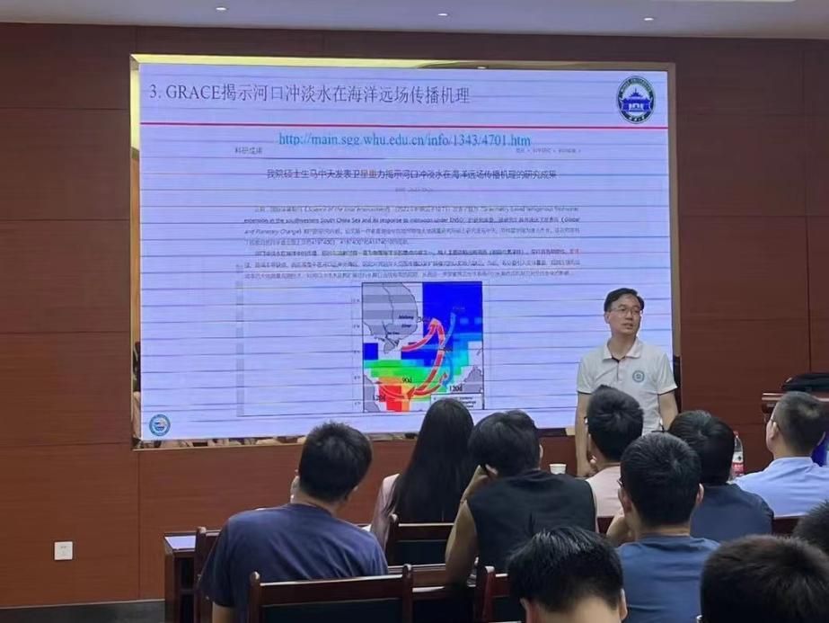 霍学深副教授从海洋水文过程的研究背景出发,介绍了河口冲淡水研究的相关技术难点,提出了引入大地测量观测技术对河口冲淡水及其扩展进行研究,进一步扩展时变重力卫星观测在海洋中的应用范围。随后,他介绍了传统方法与卫星重力方法进行河口冲淡水观测的不同之处,并详细阐述了卫星重力方法的技术优势,其可有效揭示河口冲淡水在海洋远场的传播机理。