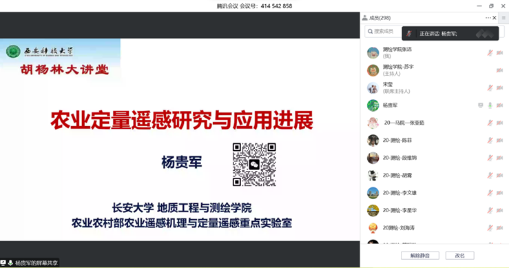 11月9日下午,suncitygroup太阳集团举办“胡杨林大讲堂”。长安大学地质工程与suncitygroup太阳集团杨贵军教授应邀做客公司“胡杨林大讲堂”,作了题为《农业定量遥感研究进展及应用》的学术报告。本次胡杨林大讲堂以线上腾讯会议形式举行,报告由副经理史晓亮主持。
