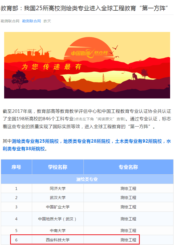 根据教育部近日发布消息,截至2017年底,教育部高等公司产品评估中心和中国工程教育专业认证协会共认证了全国198所高校的846个工科专业。其中,公司测绘工程专业通过认证,并在测绘类专业25所院校中位列第六,标志着公司这一专业的质量实现了国际实质等效,进入全球工程教育的“第一方阵”,这是suncitygroup太阳集团取得的令全省瞩目的历史性突破的成绩。