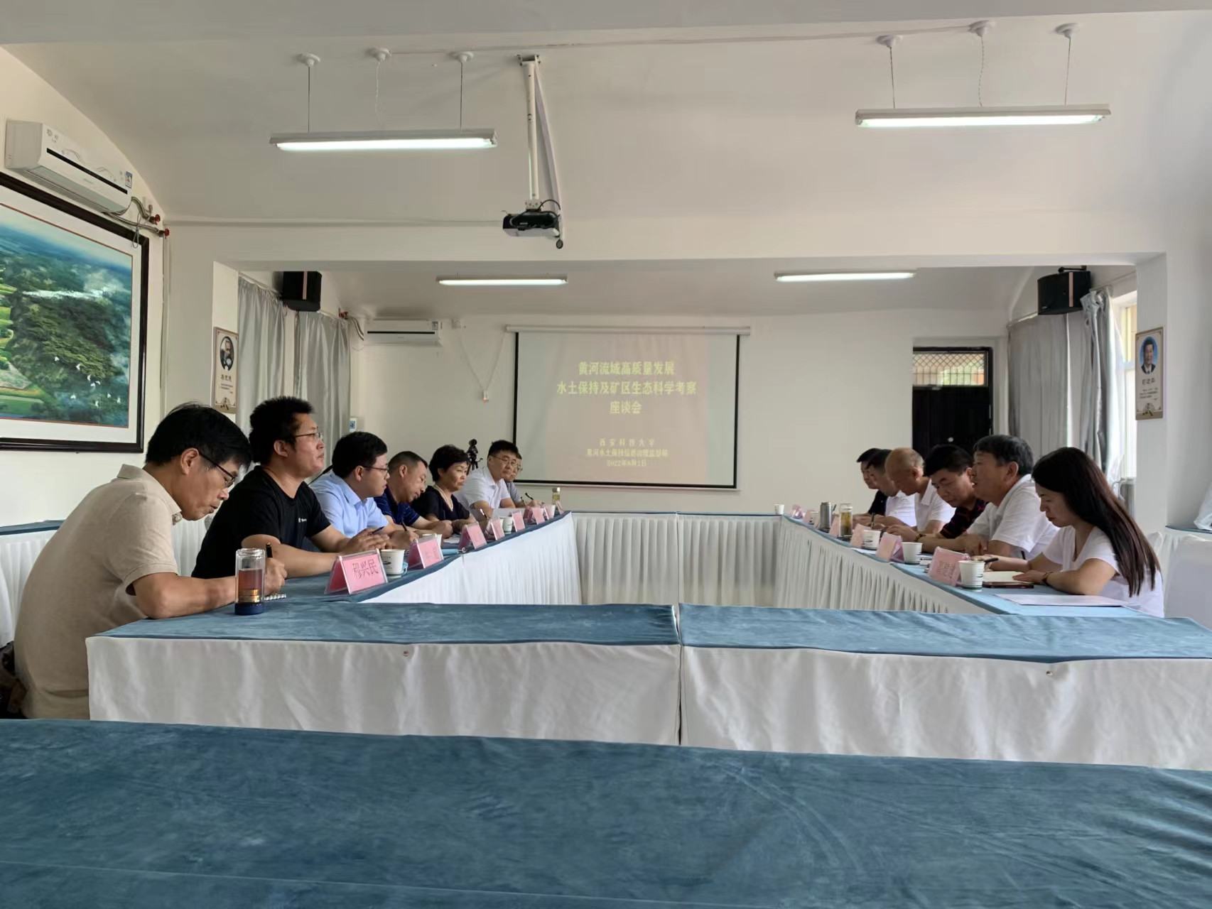 双方共同实地考察了绥德局辛店沟水土保持示范园,并召开座谈会。双方就黄河流域水土保持高质量发展提出了许多建设性的想法和建议,对矿区疏干水高效利用、采空区沉降监测及矿区生态修复等进行深入的探讨。双方表示,一是希望在现有国家自然科学基金面上项目和青年基金合作的基础上,以框架合作协议为契机,在辛店沟深入探索与研究;二是在未来矿区合作方向上,积极探索,达成共识,充分发挥资源、人才和科研优势,更全面、更深层次的合作,共同促进黄土高原水土保持高质量发展和煤矿生态可持续发展。