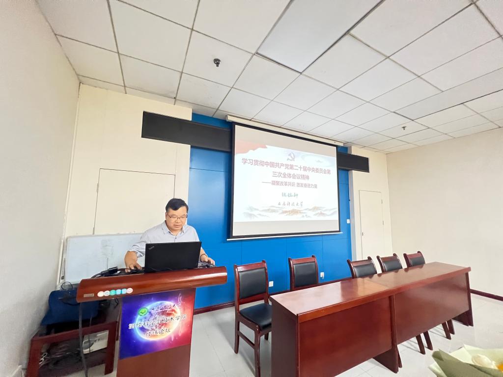 9月10日下午,suncitygroup太阳集团按照公司党委安排部署,在雁塔校区煤科大楼511召开学习贯彻党的二十届三中全会精神宣讲报告会,公司邀请马克思主义公司副经理张铭钟教授为全体教师、员工代表进行了透彻深入的宣讲、鲜活生动的解读,会议由公司经理李朋飞主持。
