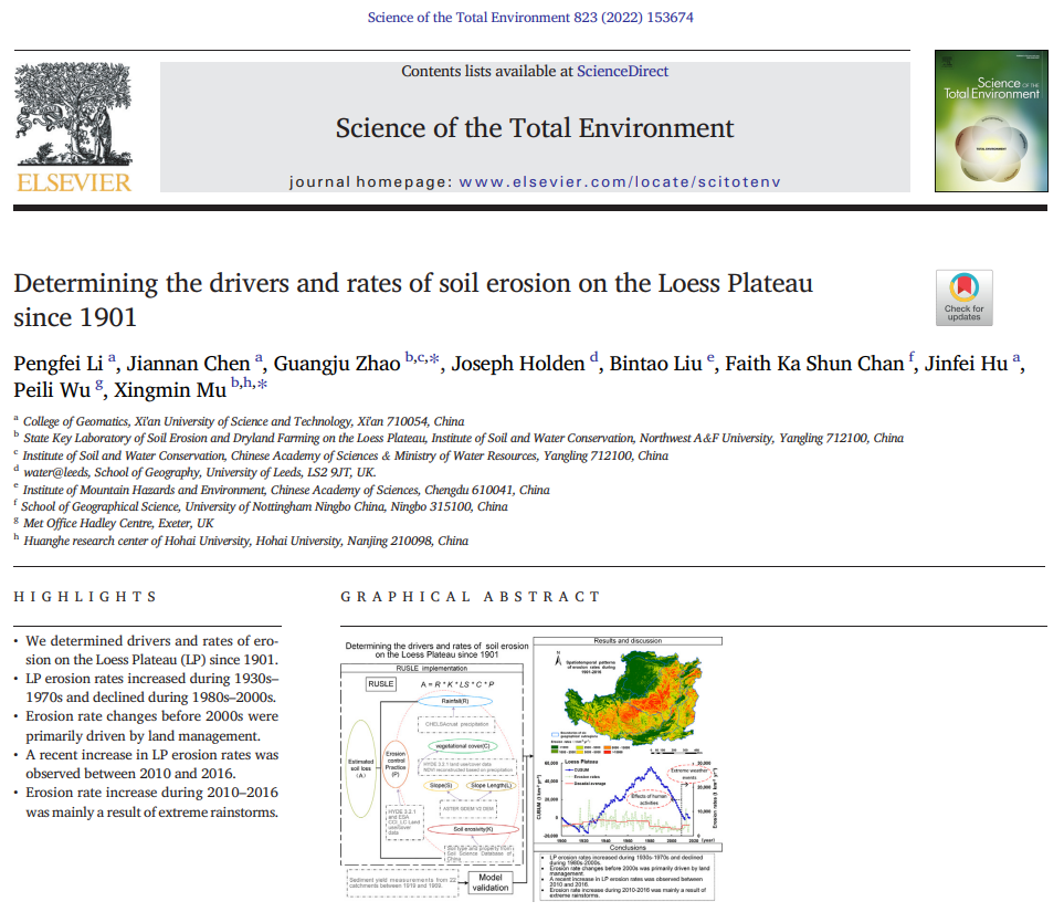 近日,公司李朋飞副教授、胡晋飞博士、联合中科院水利部水土保持研究所生态水文团队穆兴民研究员及赵广举研究员、中国科公司成都山地灾害与环境研究所刘斌涛副研究员、英国利兹大学Joseph Holden教授、英国气象中心武培立教授、宁波诺丁汉大学Faith Chan副教授等科研人员,在Science of the Total Environment发表了题为《Determining the drivers and rates of soil erosion on the Loess Plateau since 1901论文首次建立1901-2016黄土高原土壤侵蚀速率逐年格点数据序列,分析了黄土高原百余年土壤侵蚀的时间及空间演变特征揭示了土壤侵蚀格局演变的驱动机制,对推动黄河流域生态保护与高质量发展具有重要意义。研究人员通过整理历史时期降水数据、中低分辨率土地利用、土壤属性等资料数据,通过土地利用数据融合并结合历史植被覆盖度模拟,突破历史时期植被覆盖度与水土保持措施分布估算难题,采用修订版通用土壤流失方程(The Revised Universal Soil Loess Equation,简称RUSLE评估了1901-2016年黄土高原土壤侵蚀年际变化通过22受人类活动影响较小的中小流域实测输沙量RUSLE模型模拟结果对比分析,结果表明模型模拟精度较高,该模型可用于黄土高原土壤侵蚀状况的模拟。 不同年代间侵蚀速率变化表明,20世纪30年代到70年代,黄土高原平均侵蚀速率和侵蚀面积急剧增长,20世纪80年代至21世纪前10年,黄土高原平均土壤侵蚀速率减小至本世纪初达到最低值2010- 2016年期间,平均侵蚀速率再次反弹。2010年之前,土地利用变化是侵蚀速率变化的主要驱动力。人口增长导致的过度森林砍伐和耕作是20世纪30年代至70年代土壤侵蚀急速加剧的主要原因,而水土保持措施及退耕还林还草等政策的实施则导致了后续土壤侵蚀速率逐渐降低2010-2016年期间,极端降雨事件频发导致平均土壤侵蚀速率再次增加。未来气候变化暴雨等极端天气事件或将更加频繁因而黄土高原亟需创新侵蚀防治策略,保障区域水资源供给的同时减少极端事件的水土流失灾害风险。