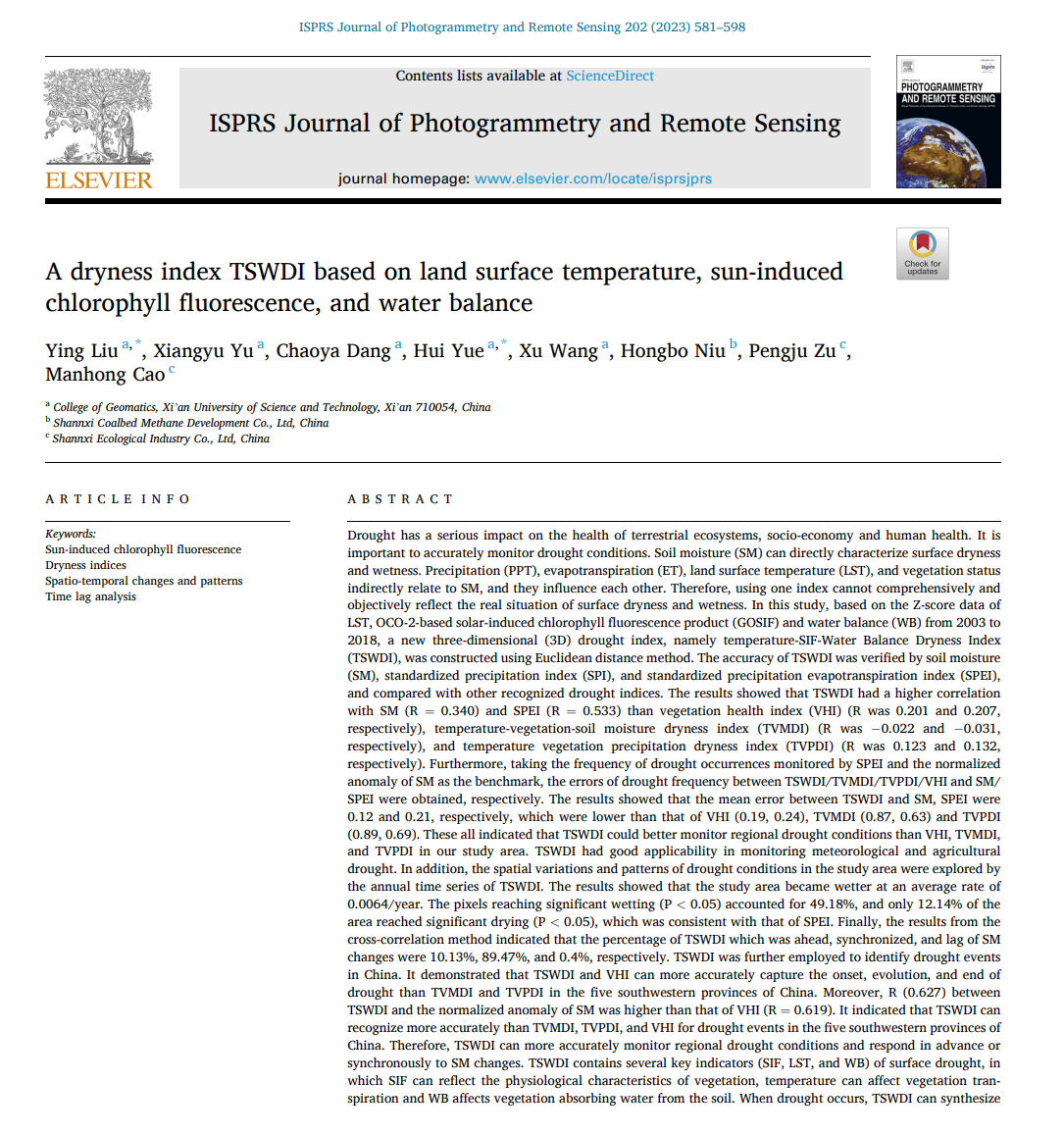 近日,suncitygroup太阳集团矿区定量遥感研究团队刘英、于翔宇(硕士研究生)、党超亚(硕士研究生)、岳辉等,在《ISPRS Journal of Photogrammetry and Remote Sensing》(P&RS)发表了题为“A dryness index TSWDI based on land surface temperature, sun-induced chlorophyll fluorescence, and water balance”的研究论文。ISPRS Journal of Photogrammetry and Remote Sensing(P&RS)是国际摄影测量与遥感学会(ISPRS)的官方期刊。P&RS被公认为遥感领域最具权威性的国际期刊之一,2022年最新影响因子为12.7,5年影响因子为12.4,该杂志为所有国家从事摄影测量、遥感、空间信息系统、计算机视觉和相关领域的许多学科的科学家和专业人员提供了一个交流渠道,旨在作为这些学科进展的来源参考和档案。