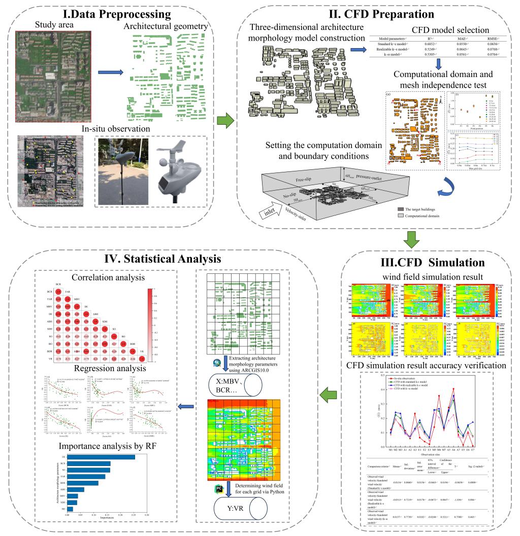 论文简介:持续推进的城市化使地表粗糙度不断上升,严重影响空气气动效应,导致通风效率变差,加剧了城市冠层内空气污染和热岛效应,给公共卫生和城市可持续性带来严峻挑战。通风效率受气象条件和建筑形态等多重因素影响。目前,计算流体力学(CFD)已被引入城市风场模拟中,然而CFD湍流模型在街区尺度的可靠性缺乏与原位观测数据的对比验证,特定区域研究结果的科学性缺少泛化性评价,限制了其在客观场景的应用和规划策略的落地。文章提出一种将地理信息系统(GIS)、CFD和人工智能(AI)集成以量化建筑形态及风场的新方案。结果表明:1)标准k-ε模拟结果与原位观测数据高度一致,表明CFD可有效预测城市街区尺度风场;2)特定街区尺度上,建筑形态参数对通风的影响按重要性递减排序为围合度,建筑密度、开阔度,容积率和建筑分散度;3)建筑形态对风的影响在于风的流动模式、压力分布和湍流效应;4)对照试验结果证明本文结果具有泛化性。该方案可为探索城市风热环境和空气污染物扩散提供一定参考。